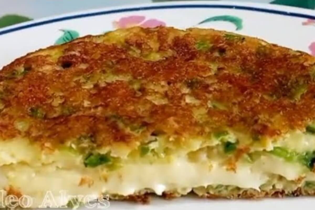 - Disponha metade dessa mistura numa frigideira pequena, levemente untada com azeite, coloque a mussarela fatiada a gosto, e despeje o restante da massa.
