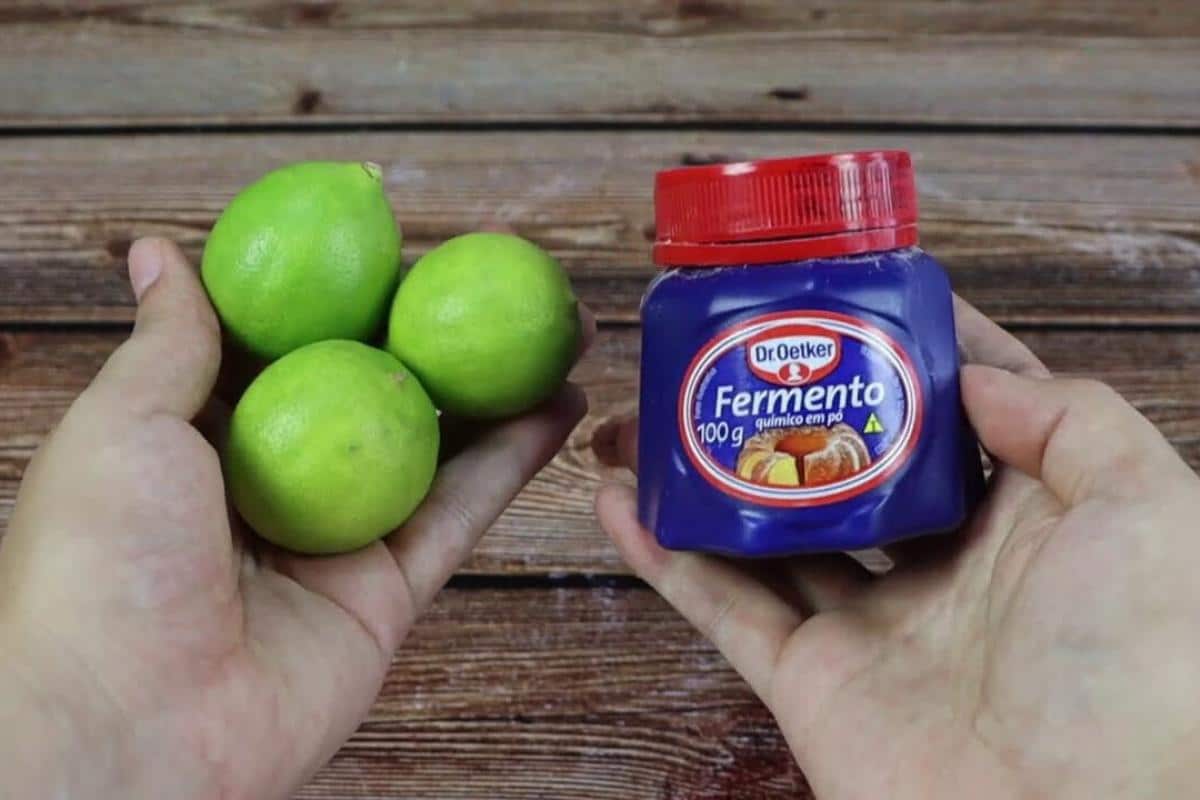 - Em uma tigela, coloque o limão espremido, o detergente neutro, o fermento químico em pó e o vinagre de álcool branco.